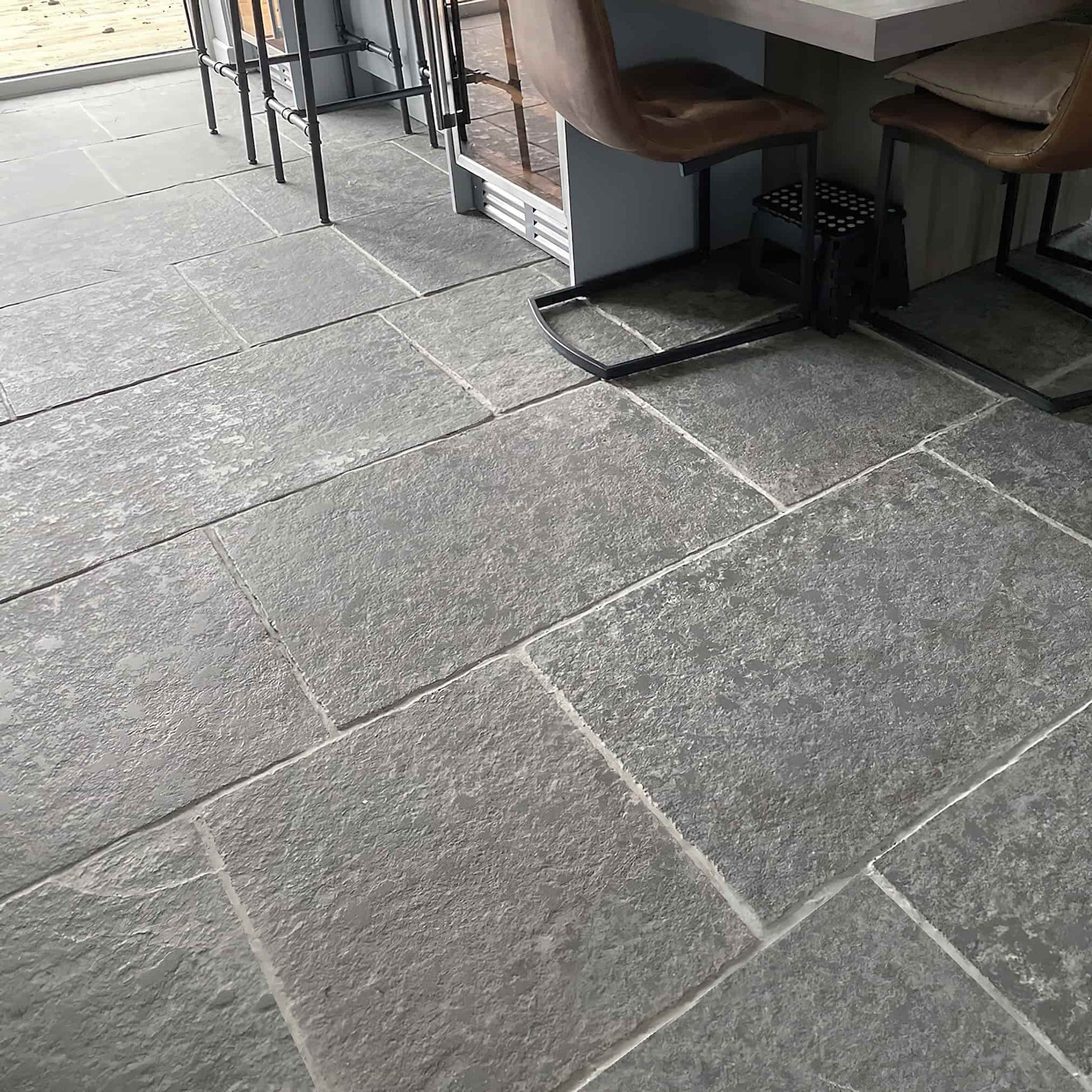 Das Kalksteinpflaster LIMA GRIS besticht durch seine sanfte und nuancierte graue Farbe , die je nach Lichteinfall durch leichte grüne Reflexe unterbrochen wird. Seine natürlich gespaltene Oberfläche und die gesägten Kanten verleihen ihm ein authentisches und zeitloses Aussehen, perfekt für Landhäuser, Bauernhäuser oder alte Renovierungen .