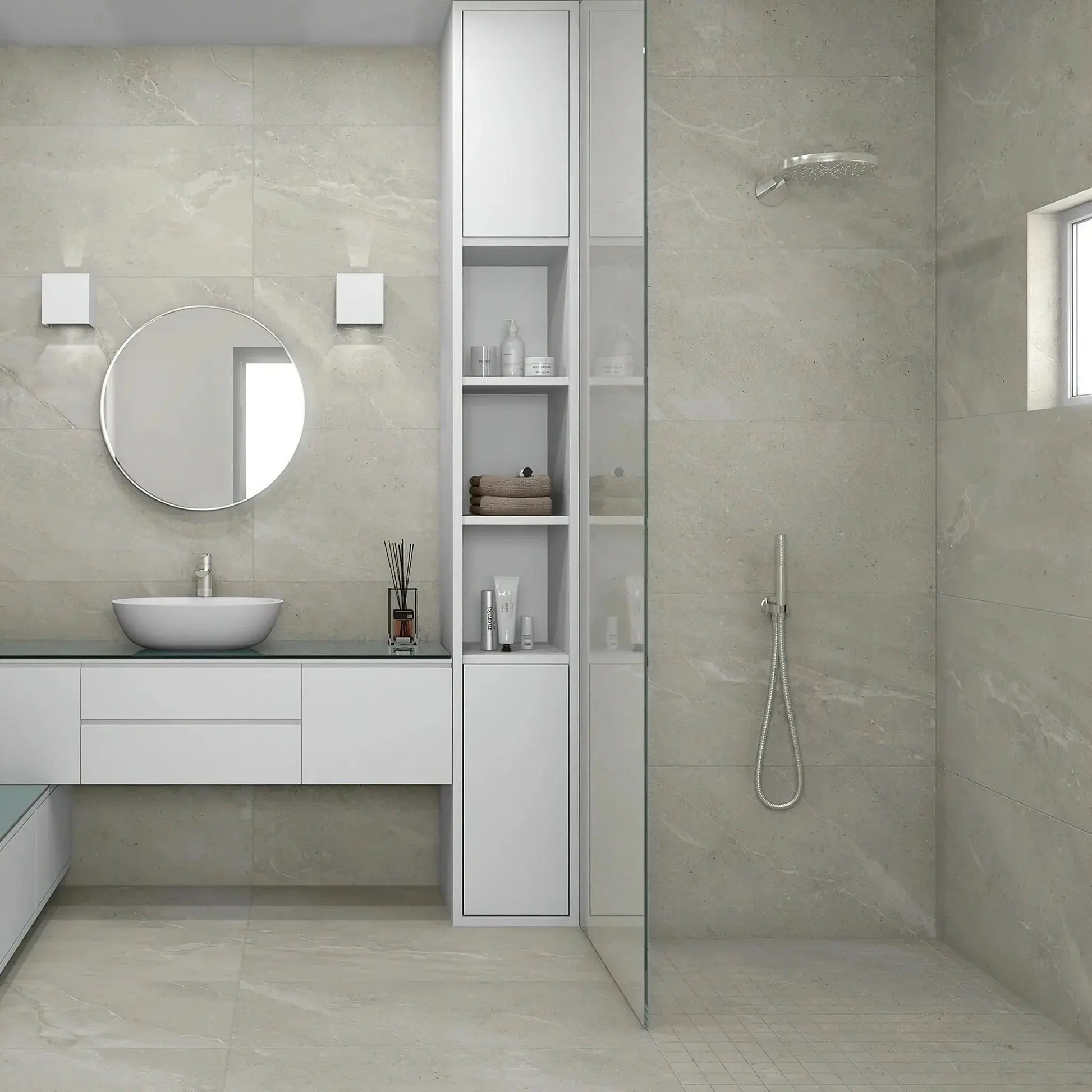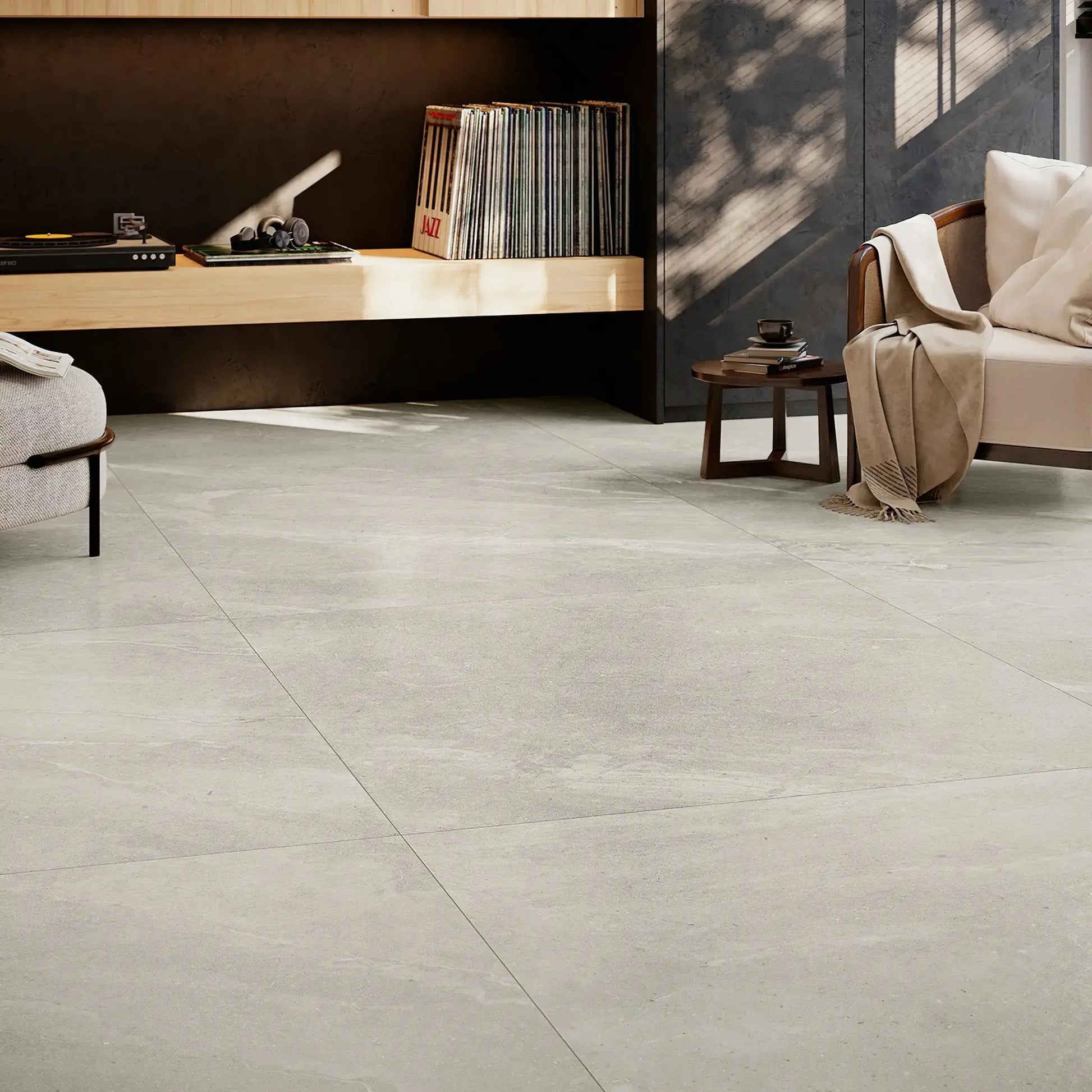 Avec ses grandes dalles de 90x90 cm, EKIO crée un espace contemporain et lumineux, parfait pour mettre en valeur vos intérieurs.