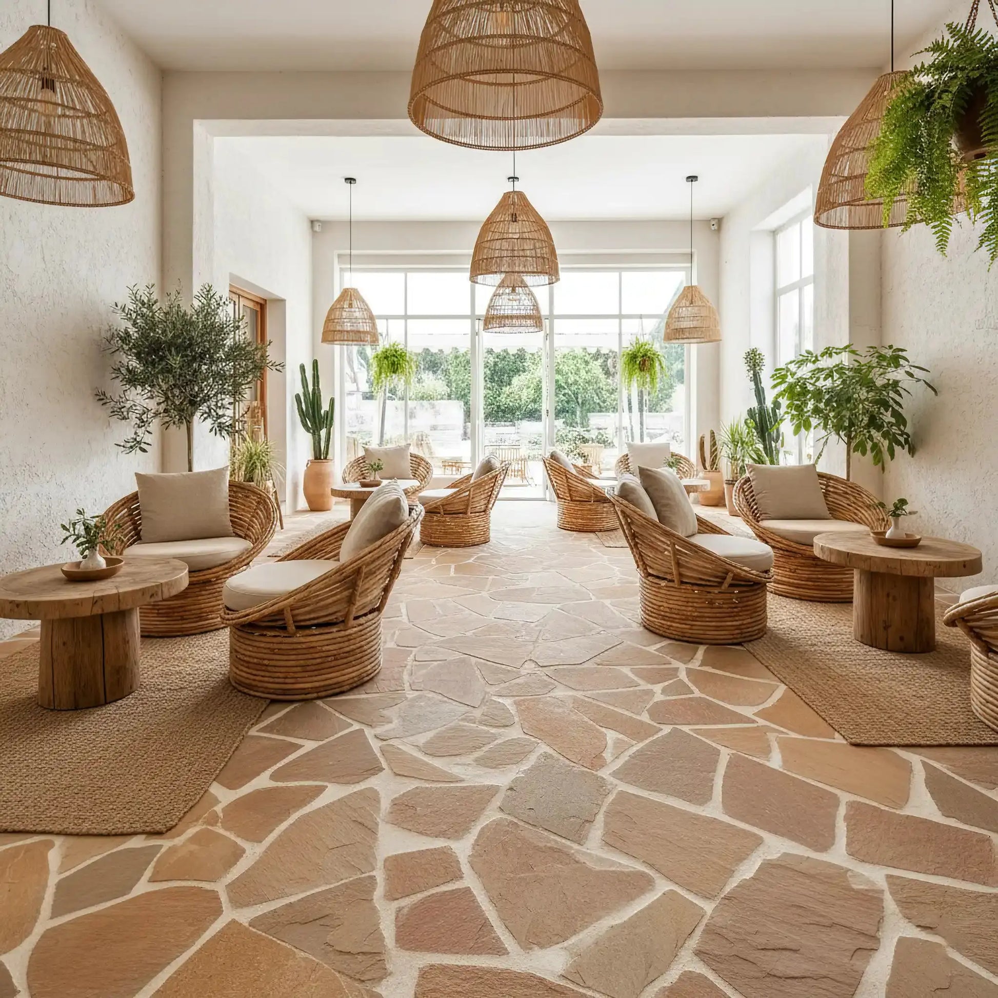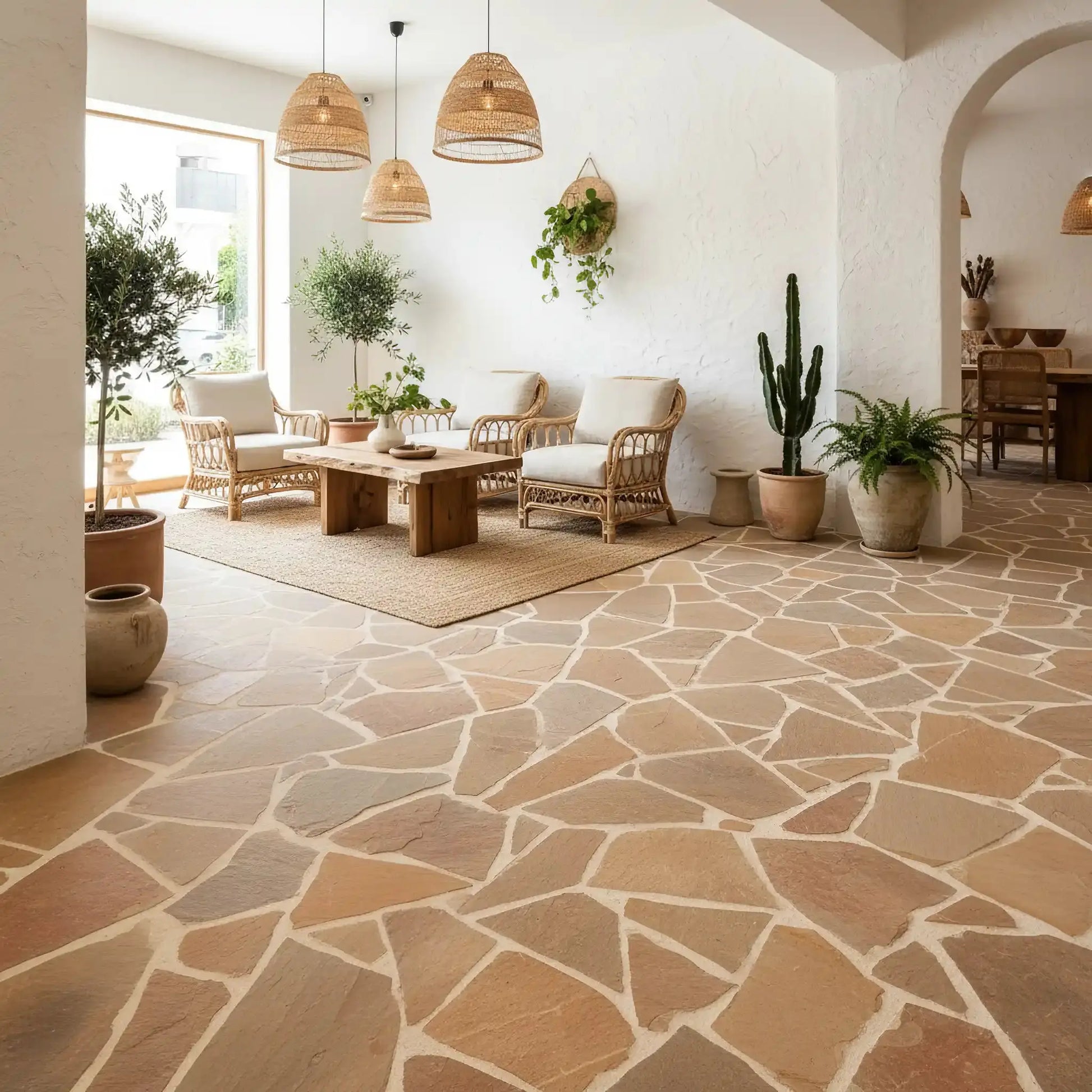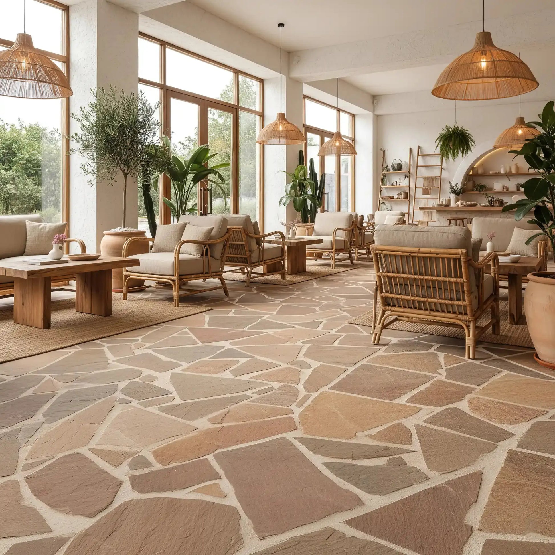 Jede Platte ist von Natur aus unregelmäßig und kann lose verlegt werden. Dadurch entsteht ein einzigartiger, strukturierter, aber nicht starrer Boden. Dieses Format hebt die Textur und Nuancen des Steins hervor, egal ob im Wohnzimmer, im Eingangsbereich, im Flur oder im Ruhebereich.