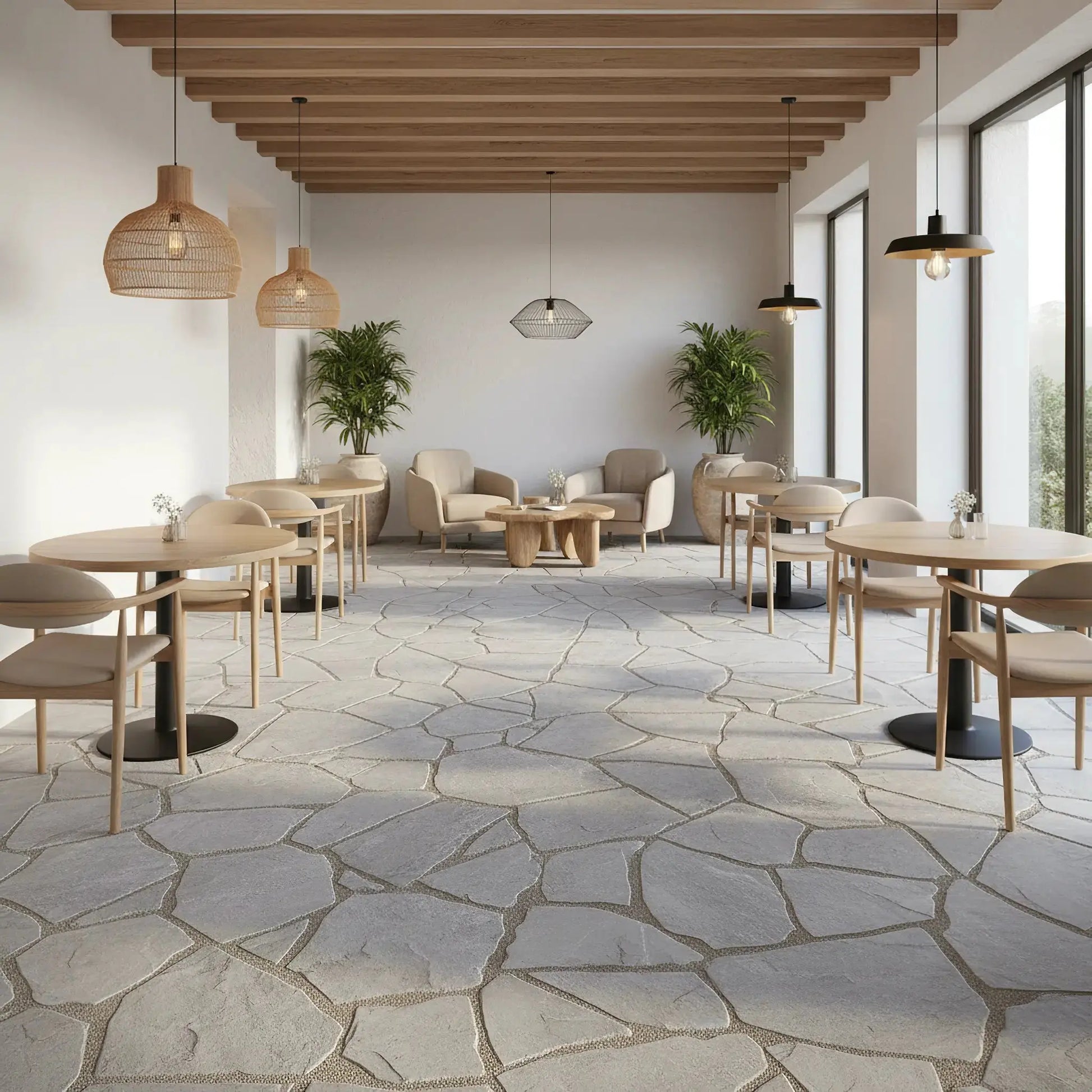 Die unregelmäßig geschnittenen Fliesen ermöglichen eine lose Verlegung und erzeugen ein strukturiertes Muster, das gleichzeitig ein organisches Gefühl vermittelt. Dieser Bodenbelag eignet sich ideal, um Wohnzimmern, Eingangsbereichen, Fluren oder Übergangsbereichen Tiefe und Charakter zu verleihen.