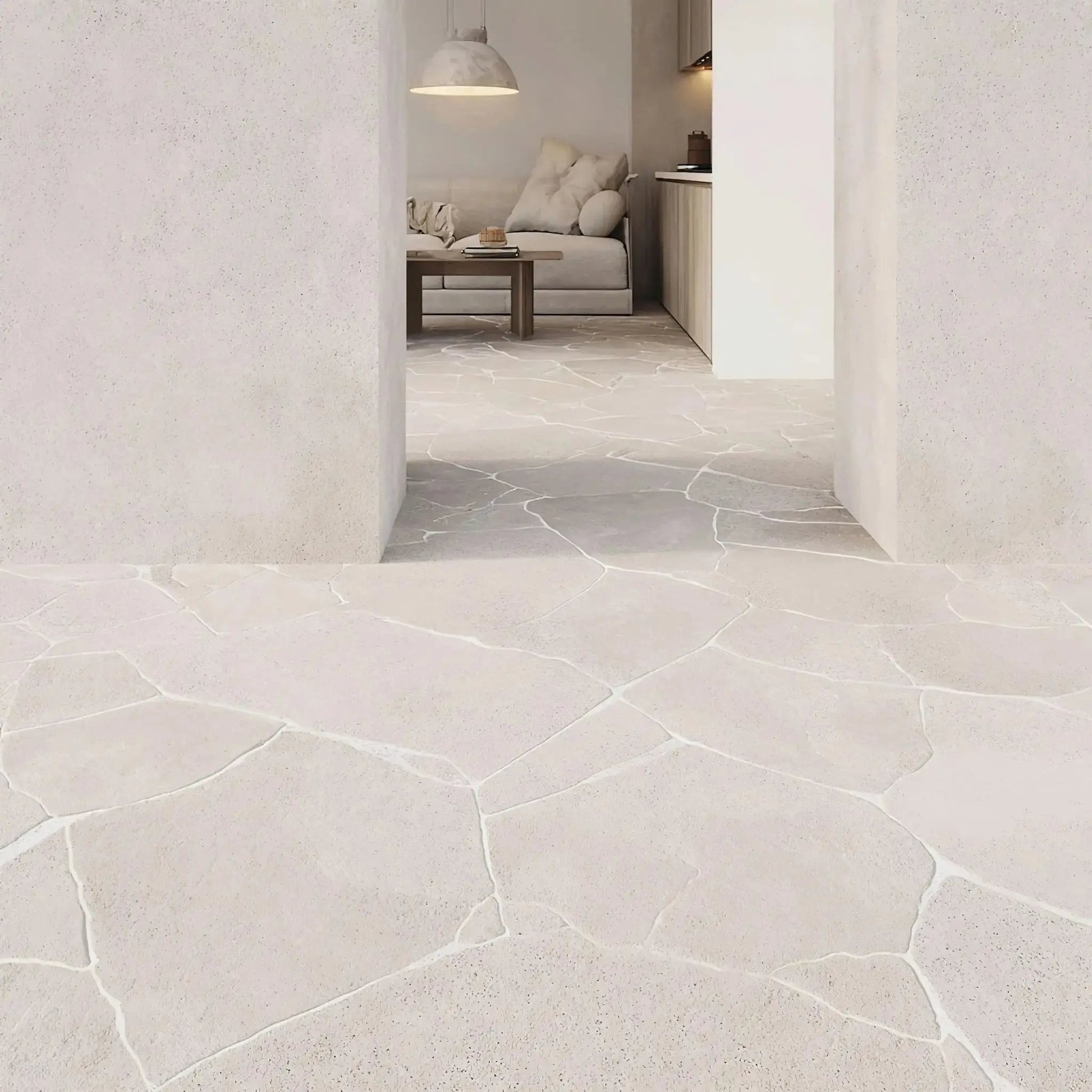 Mit seinen unregelmäßigen Formen und der gebürsteten, sandgestrahlten Oberfläche bietet dieser Bodenbelag ein authentisches Aussehen und fühlt sich gleichzeitig angenehm an. Er eignet sich ideal für den Einsatz im Innen- und Außenbereich , insbesondere für Innenhöfe, Hallen, Korridore oder überdachte Terrassen.