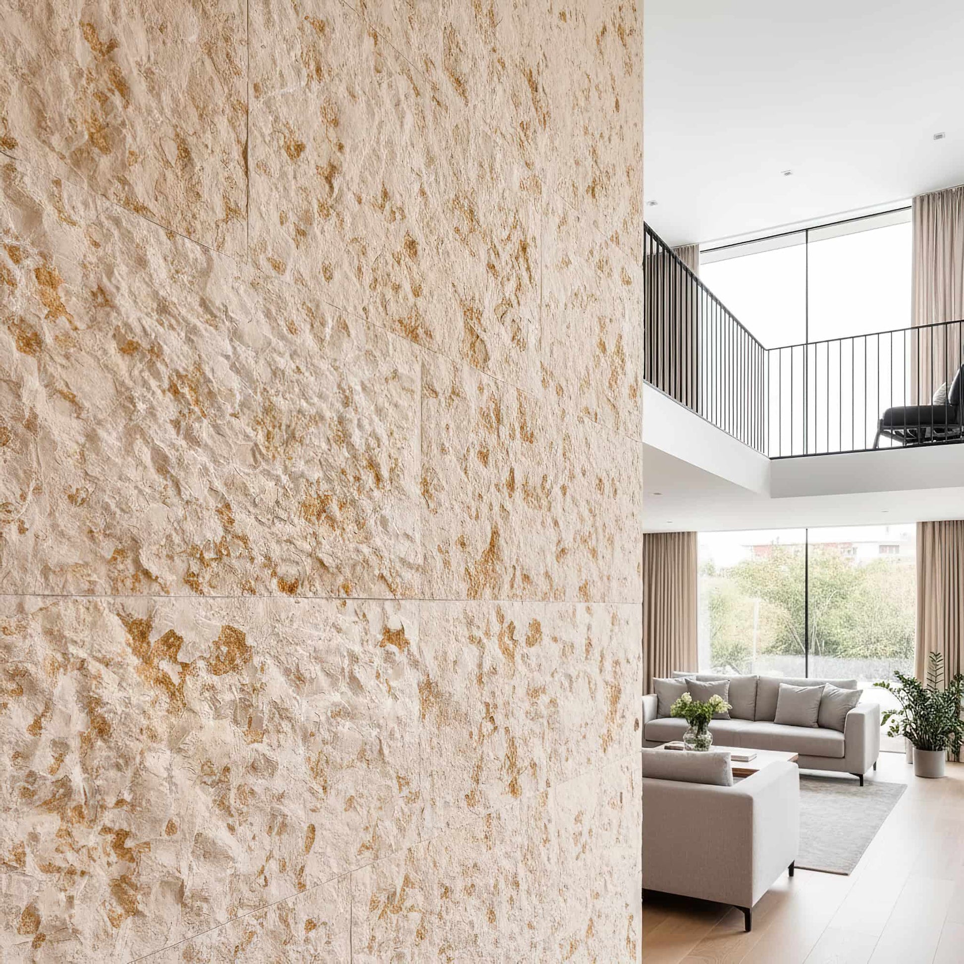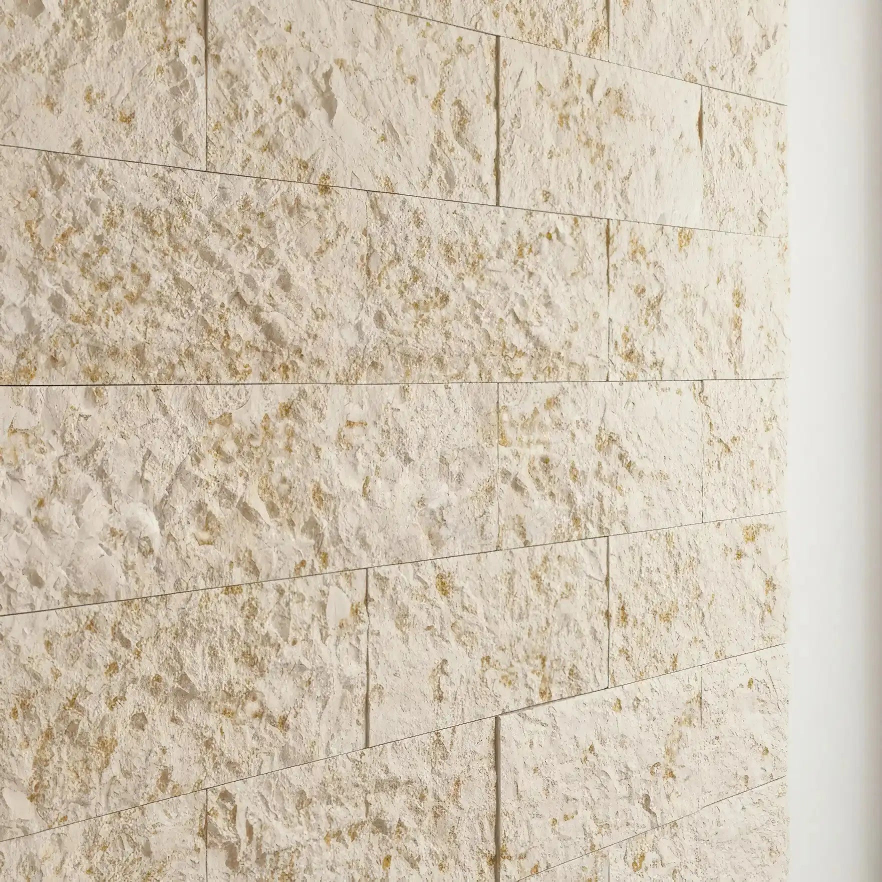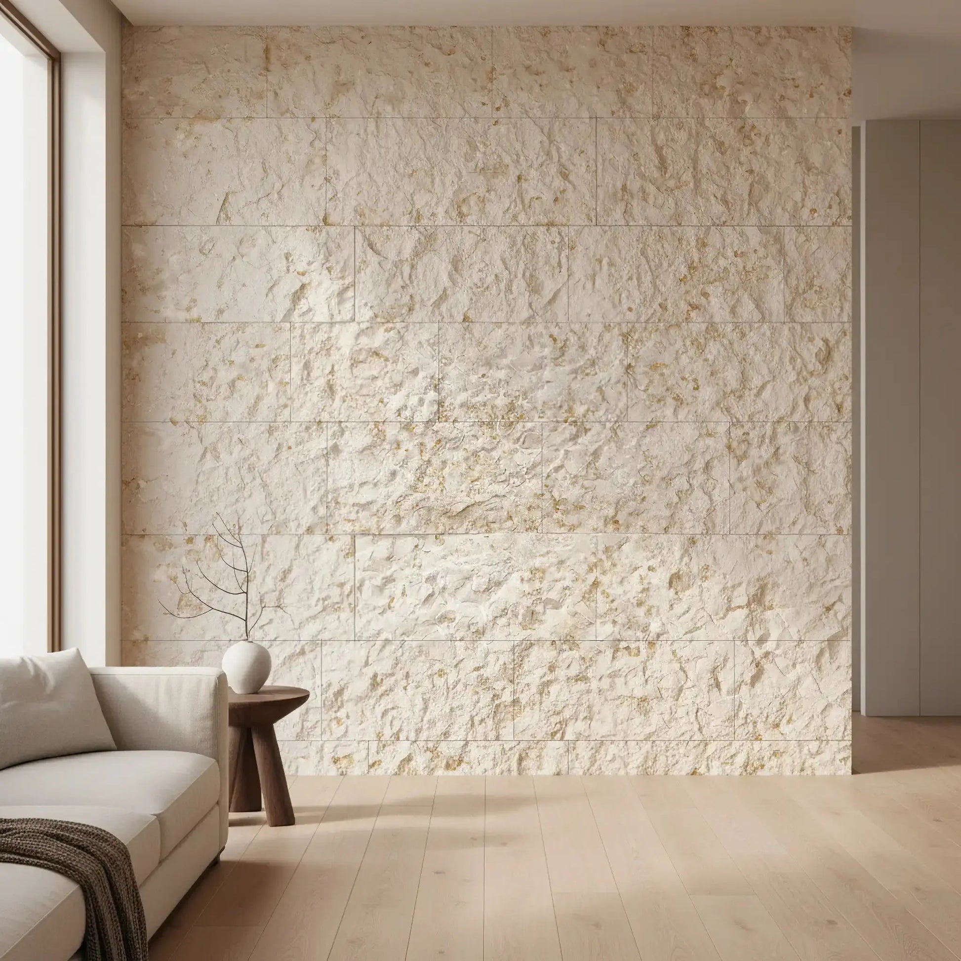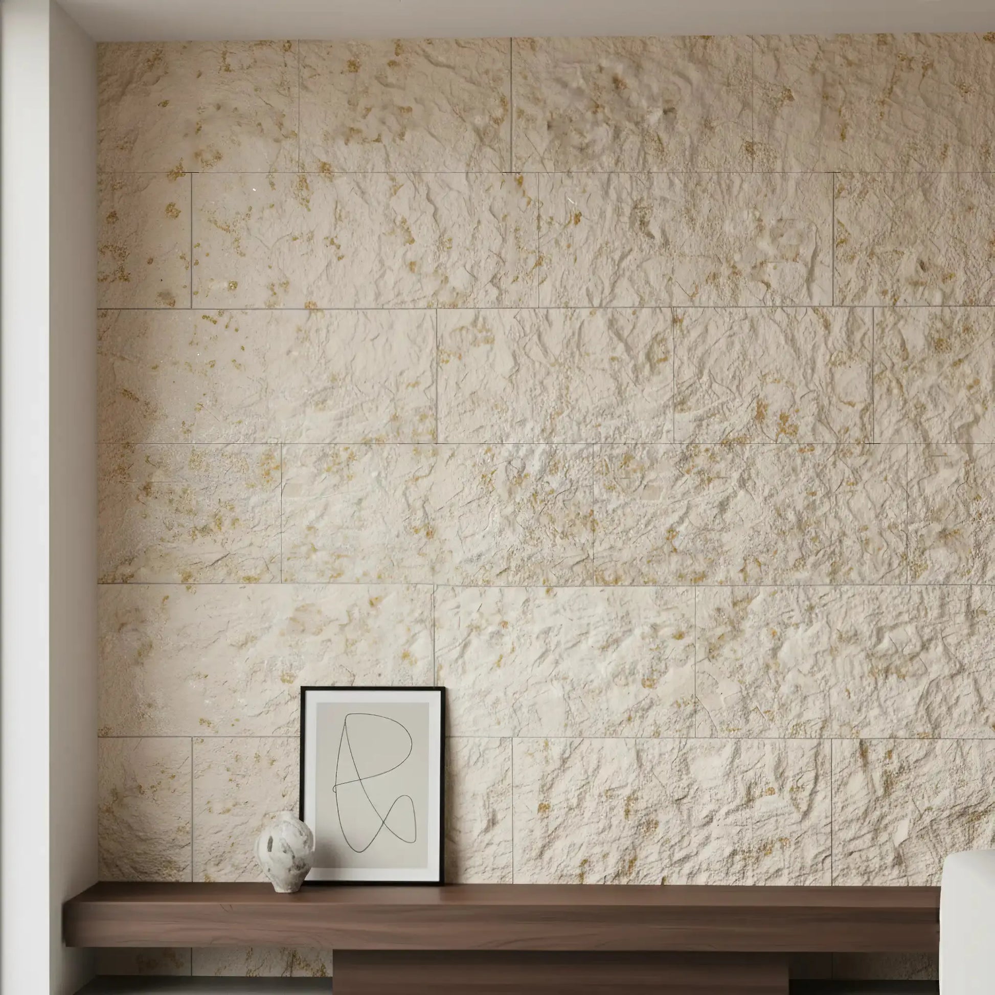Verleihen Sie Ihrem Interieur mit der Wandverkleidung aus Dune-Kalkstein einen authentischen und modernen Touch. Die raue, strukturierte Oberfläche, die durch dezente natürliche Goldakzente aufgewertet wird, erzeugt einen einzigartigen Look, der das Licht einfängt und jedem Raum Charakter verleiht.