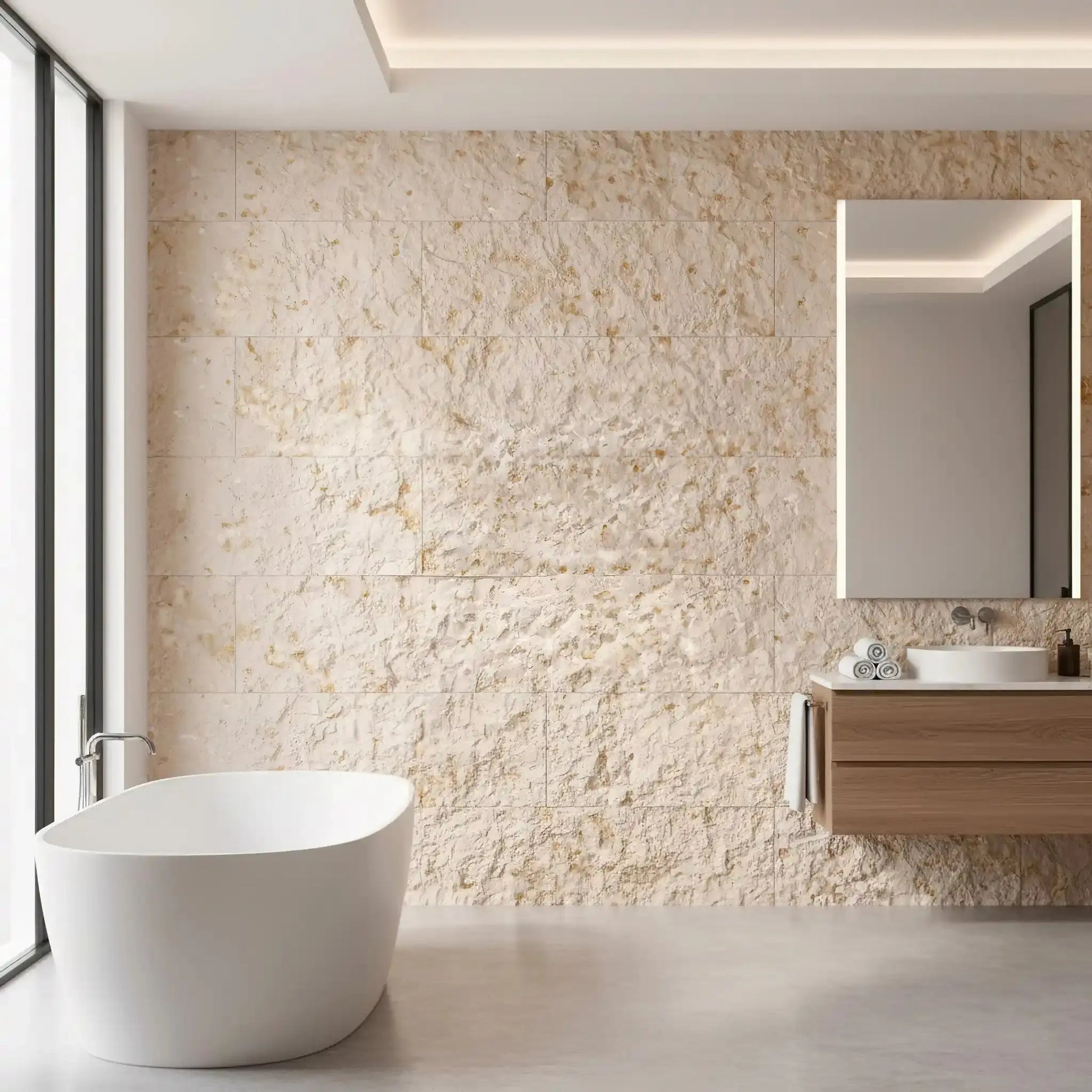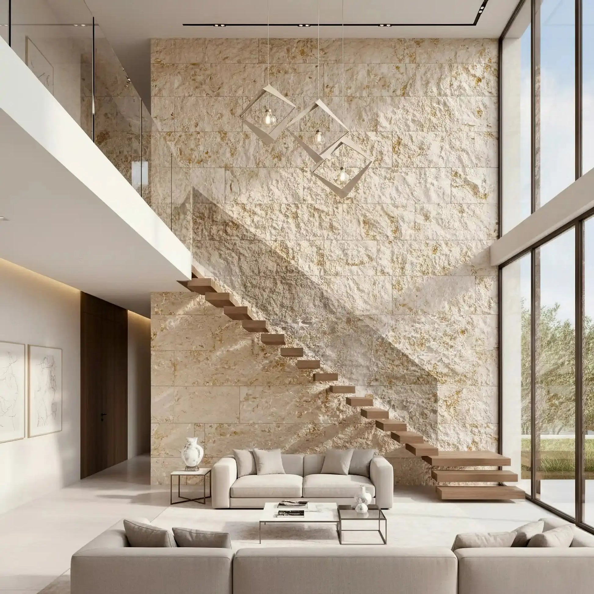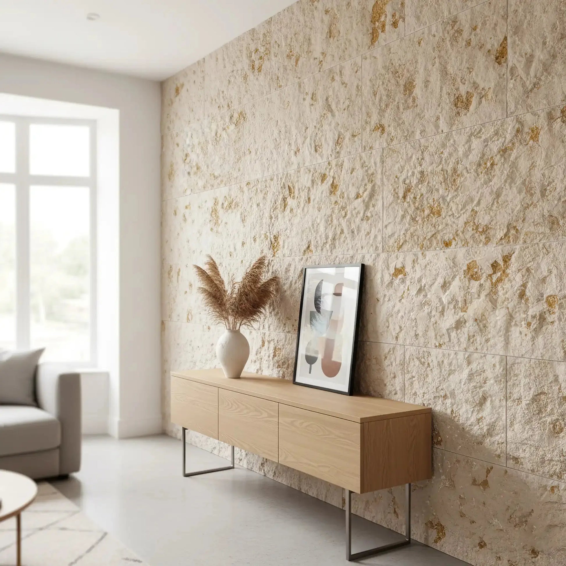 Verleihen Sie Ihrem Interieur mit der Wandverkleidung aus Dune-Kalkstein einen authentischen und modernen Touch. Die raue, strukturierte Oberfläche, die durch dezente natürliche Goldakzente aufgewertet wird, erzeugt einen einzigartigen Look, der das Licht einfängt und jedem Raum Charakter verleiht.