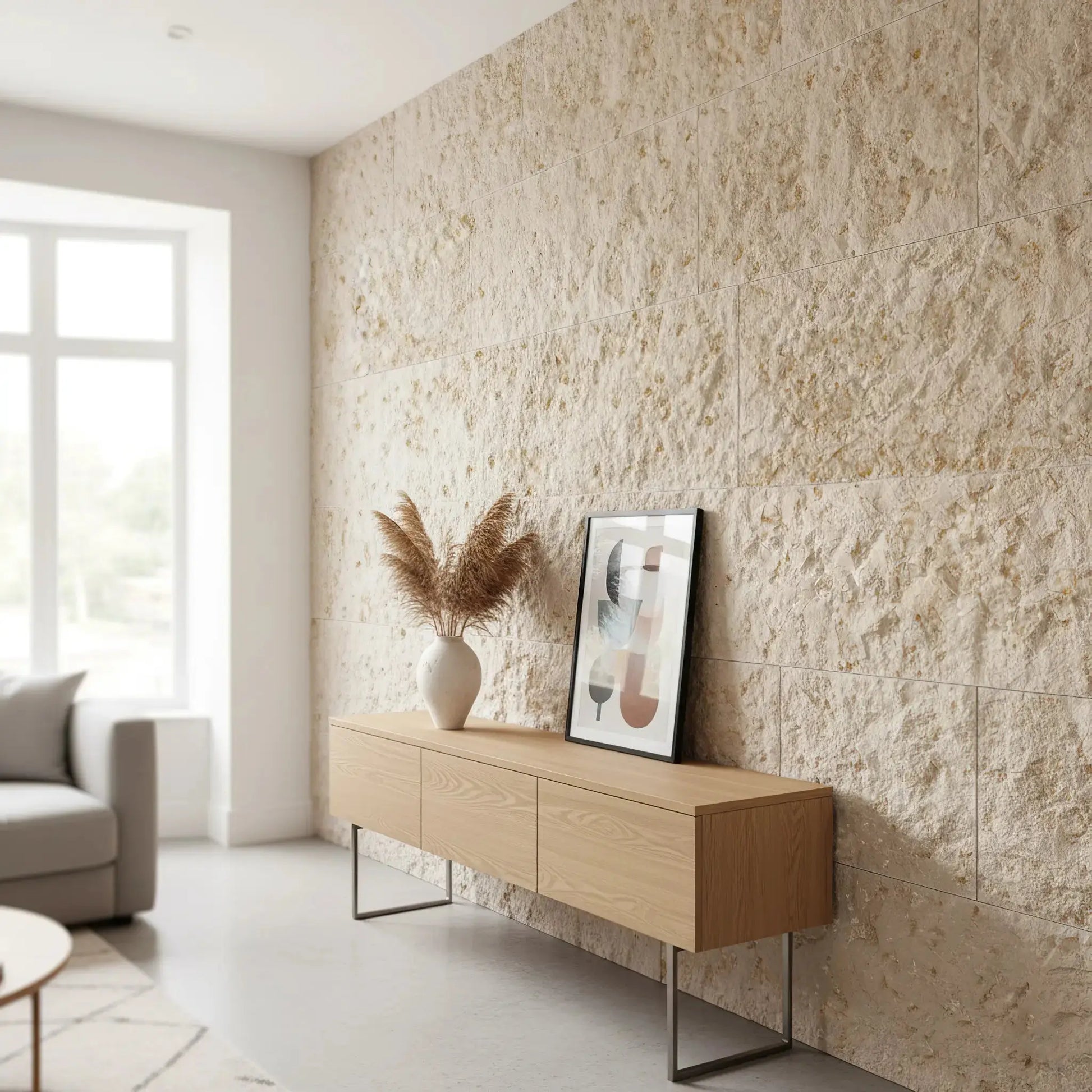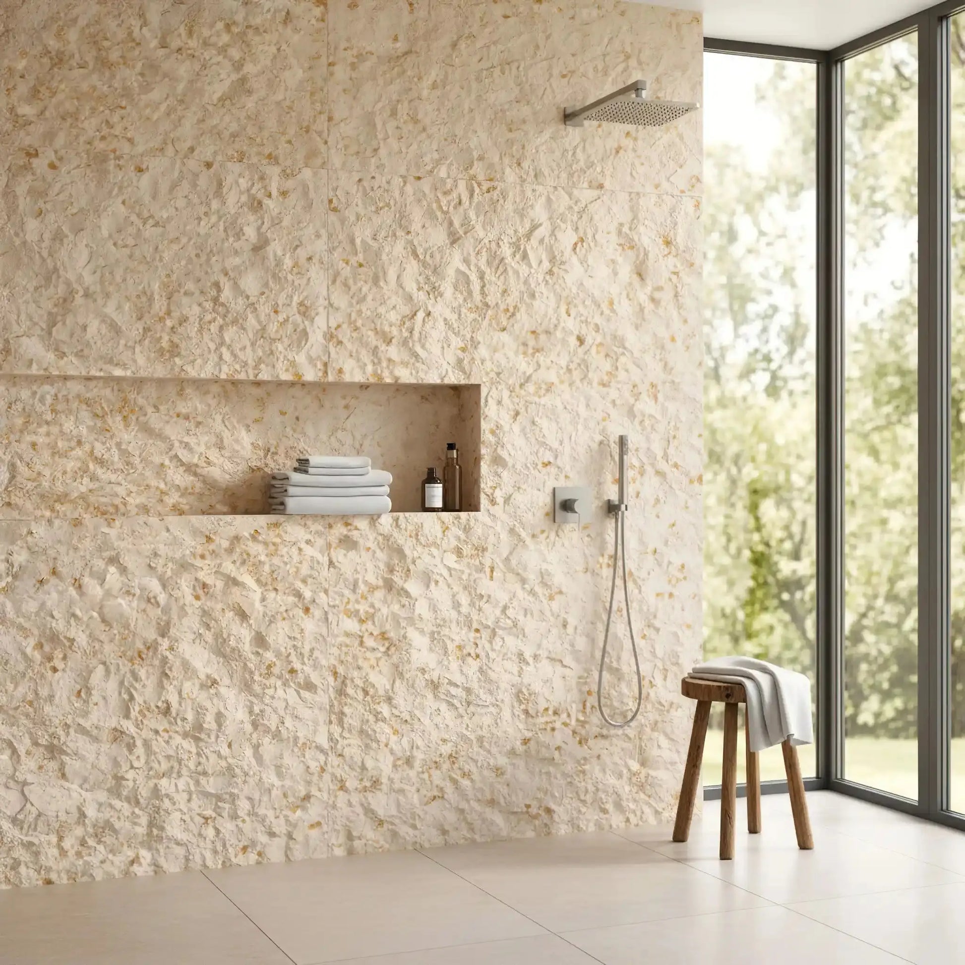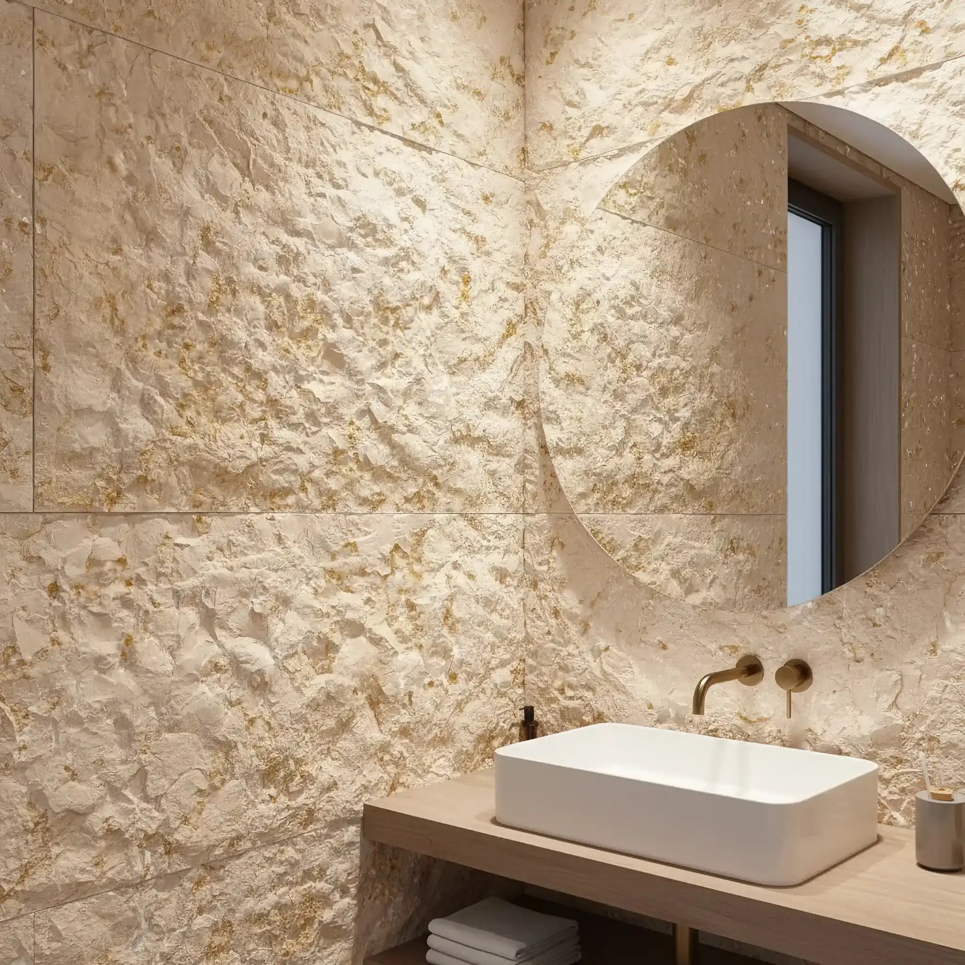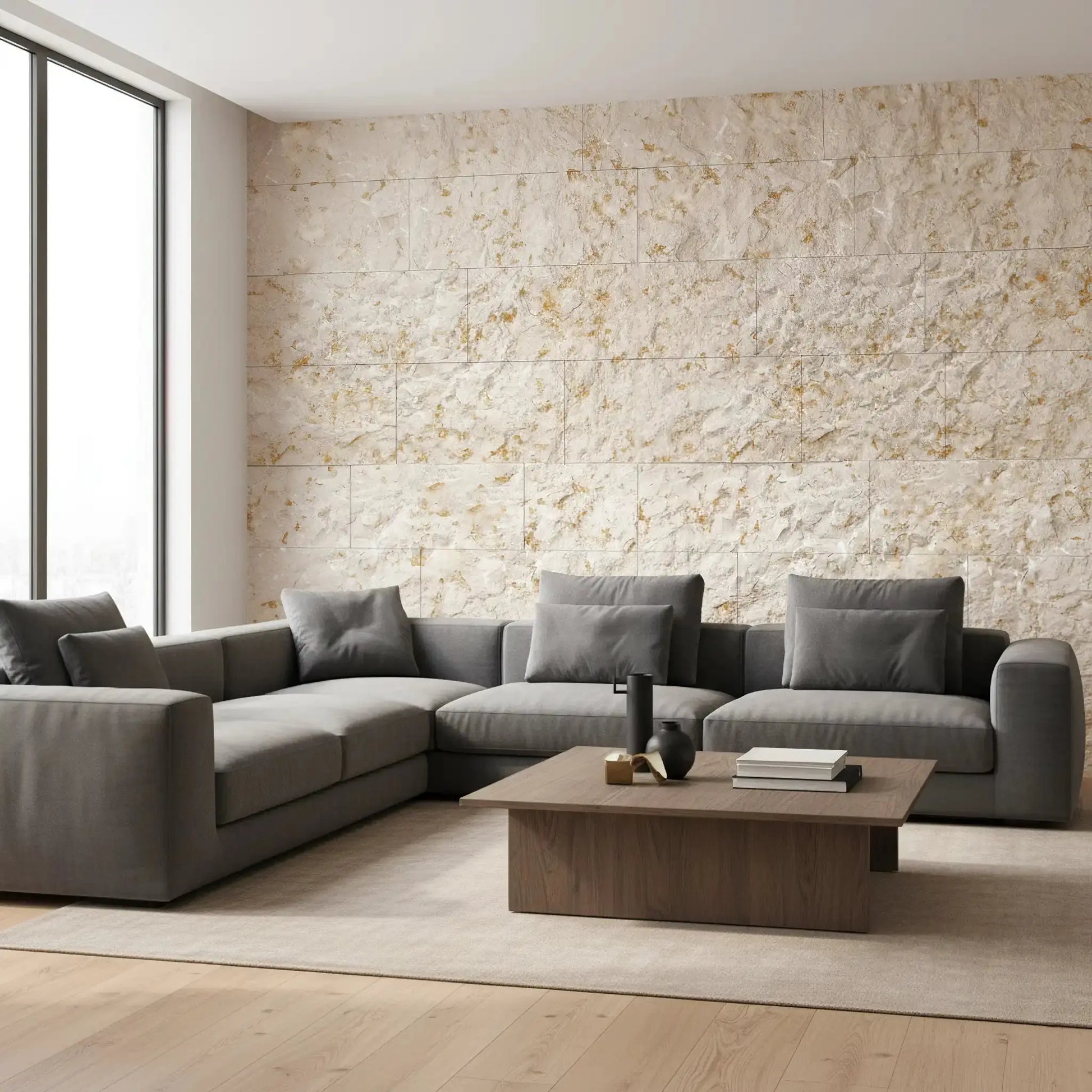 Verleihen Sie Ihrem Interieur mit der Wandverkleidung aus Dune-Kalkstein einen authentischen und modernen Touch. Die raue, strukturierte Oberfläche, die durch dezente natürliche Goldakzente aufgewertet wird, erzeugt einen einzigartigen Look, der das Licht einfängt und jedem Raum Charakter verleiht.