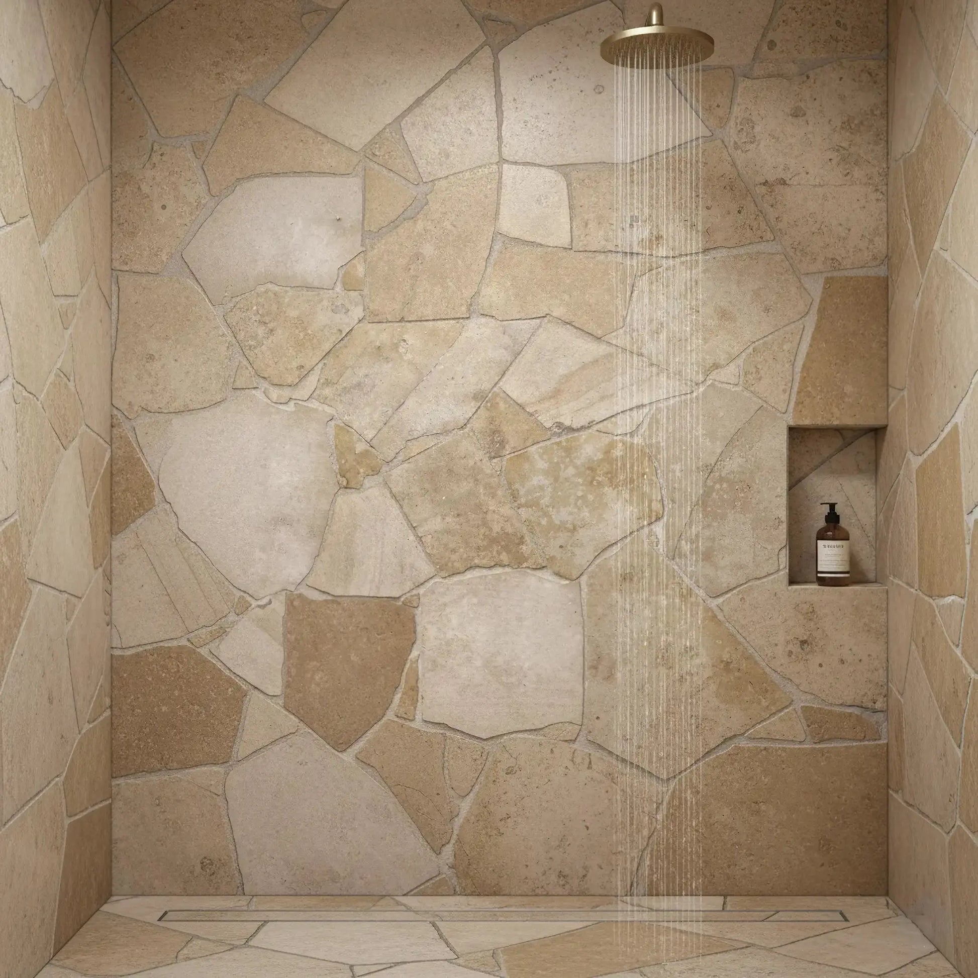 Jeder Stein ist unregelmäßig geschnitten, was eine lockere Verlegung ermöglicht, die den natürlichen Charakter des Materials unterstreicht. Diese Art der Pflasterung wird für ihr authentisches Aussehen geschätzt und schafft je nach Umgebung ein sowohl rustikales als auch modernes Ambiente.