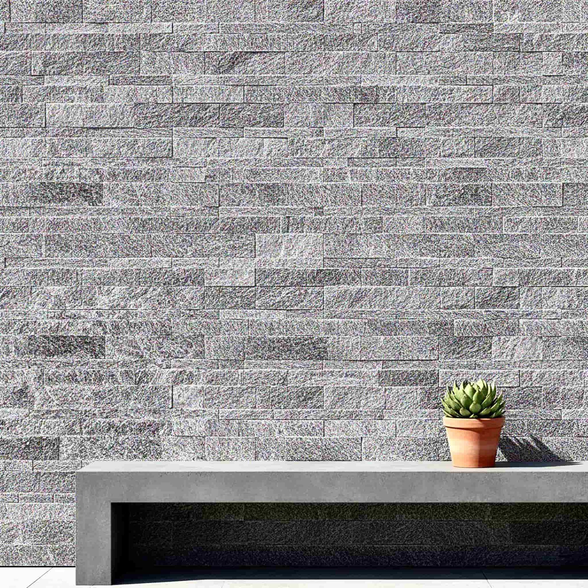 Die rohe Gneisverkleidung Alpina White präsentiert einen alpinen Stein mit starkem Charakter. Seine helle, geäderte Farbe, typisch für Gneis, verleiht jeder Wand im Innen- und Außenbereich eine natürliche Eleganz.