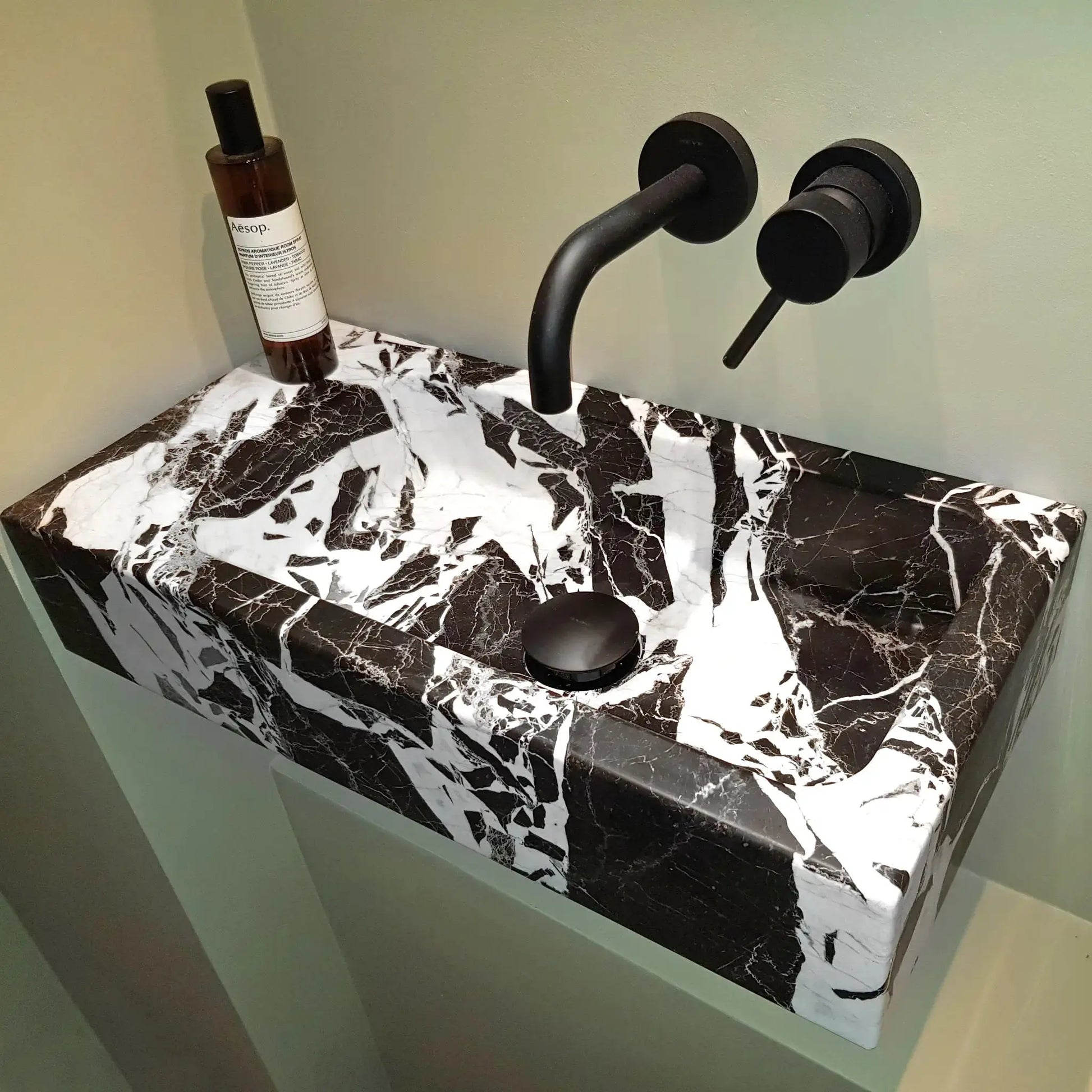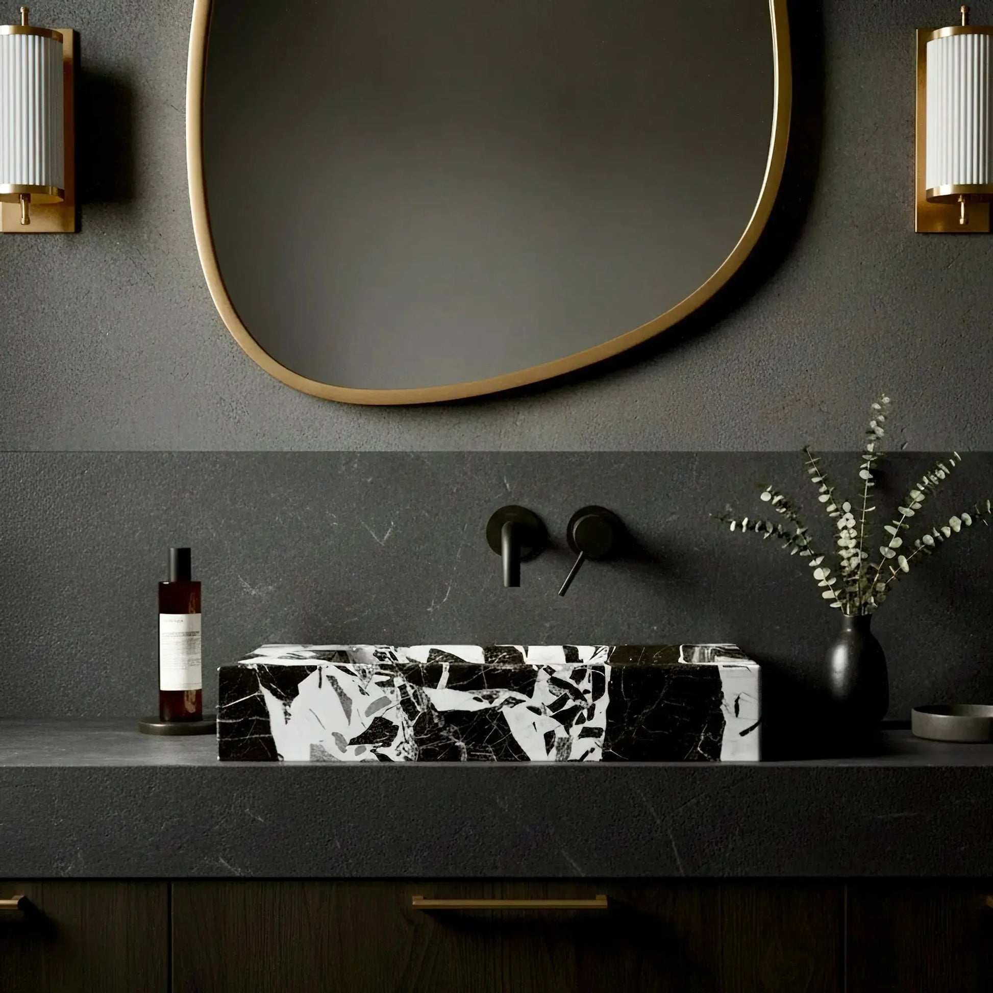 Cette vasque rectangulaire est taillée dans un Grand Antique d’Aubert d’exception, l’un des marbres français les plus prestigieux. Sa palette contrastée — noir profond et blanc éclatant — en fait une matière graphique, rare et iconique.