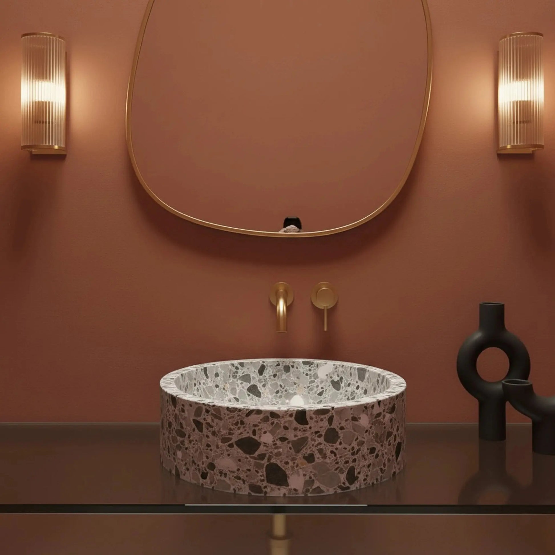 Avec Minéral, vous pouvez associer cette vasque à d’autres éléments en Breccia Parma : plan vasque, revêtements, marches ou parements.