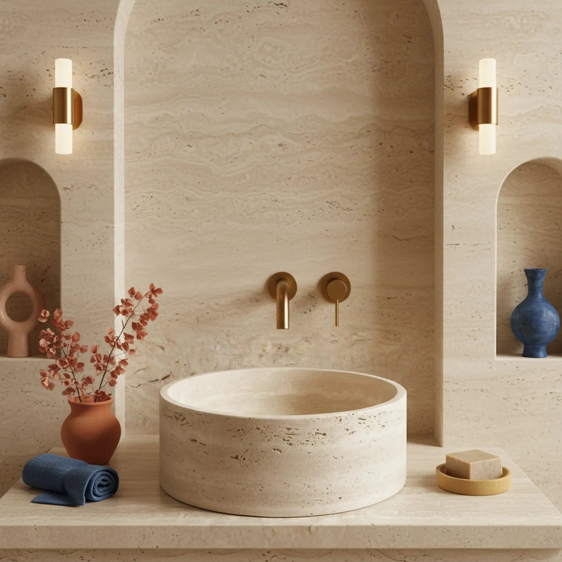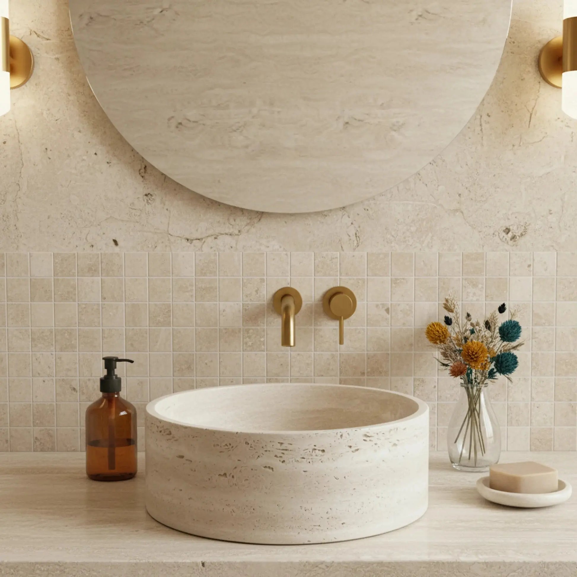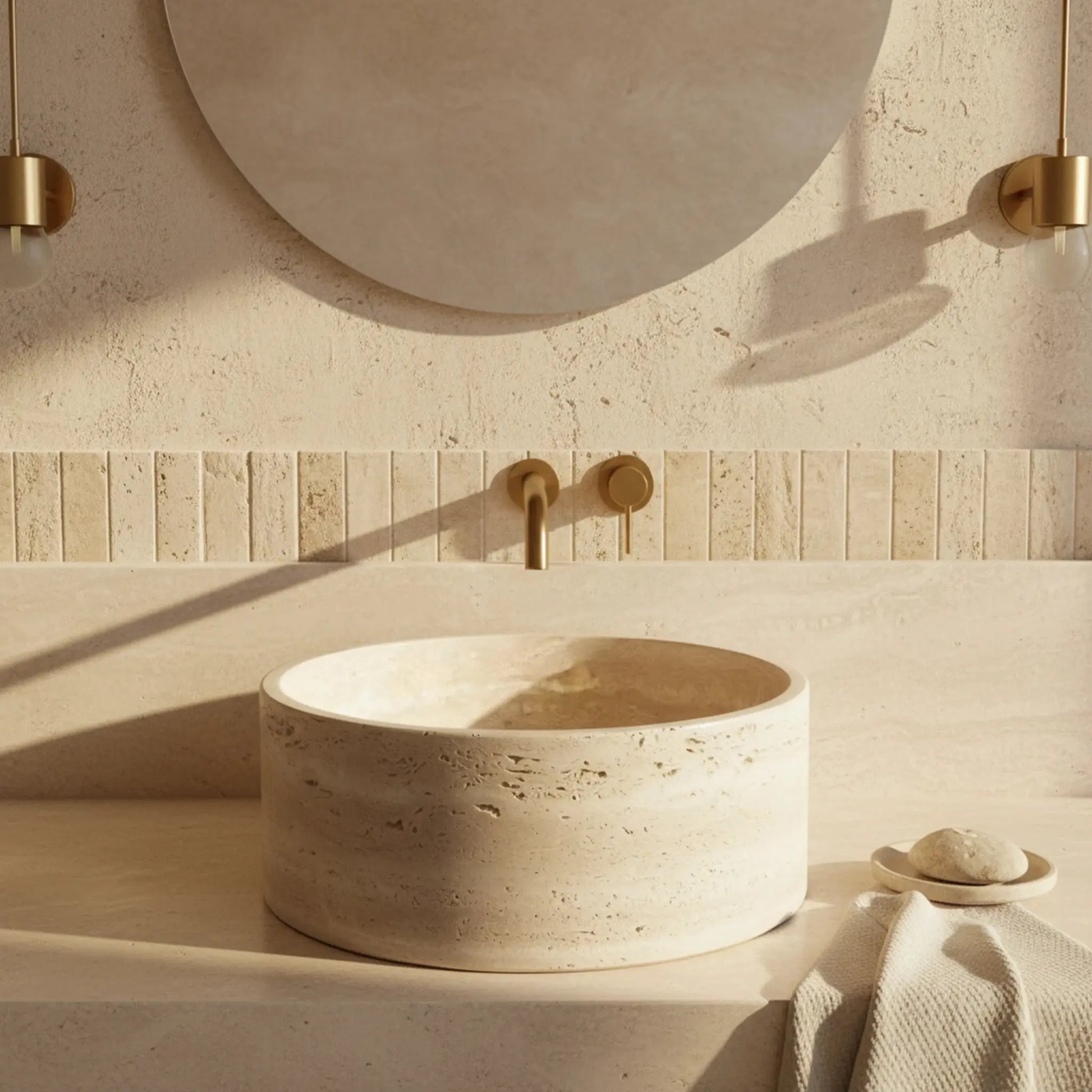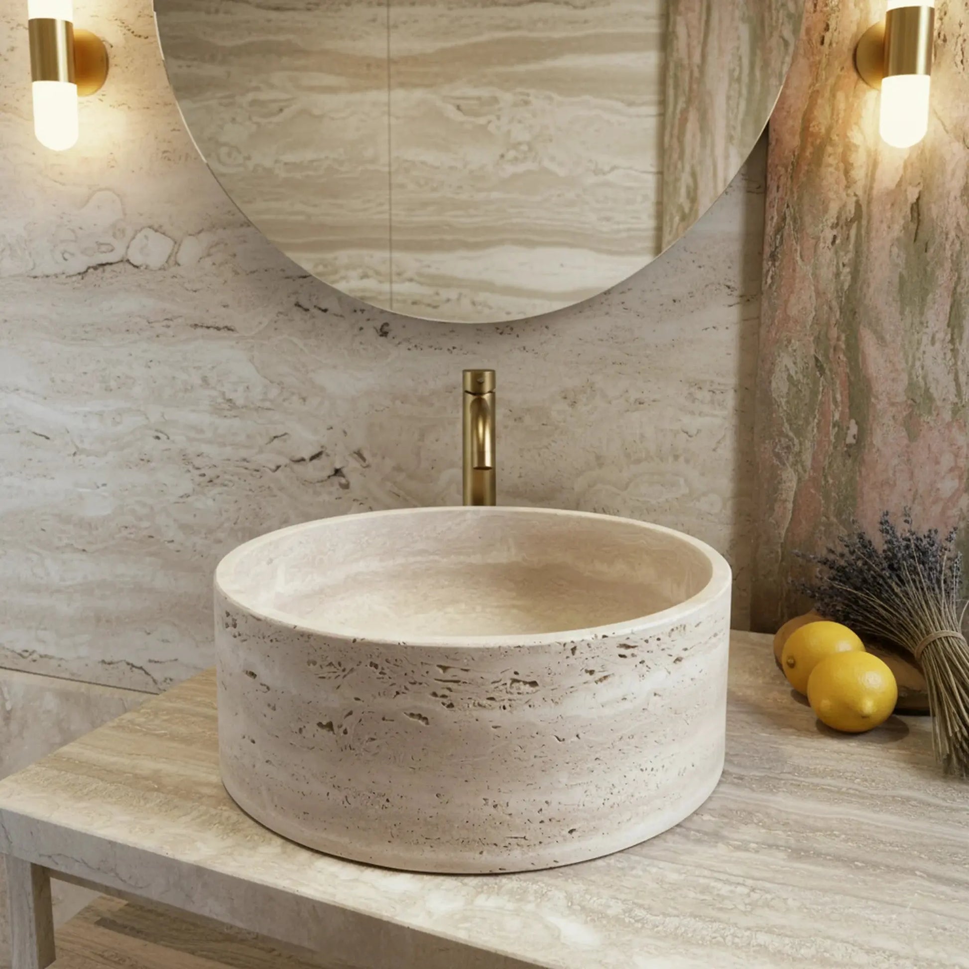 Cette vasque ronde est taillée dans un travertin romain haut de gamme, choisi pour ses nuances beiges, brunes, dorées et sable, typiques de cette pierre italienne historique. Chaque pièce est façonnée dans notre atelier de marbrerie en Moselle, où nos artisans contrôlent chaque étape pour garantir une qualité d’usinage supérieure.