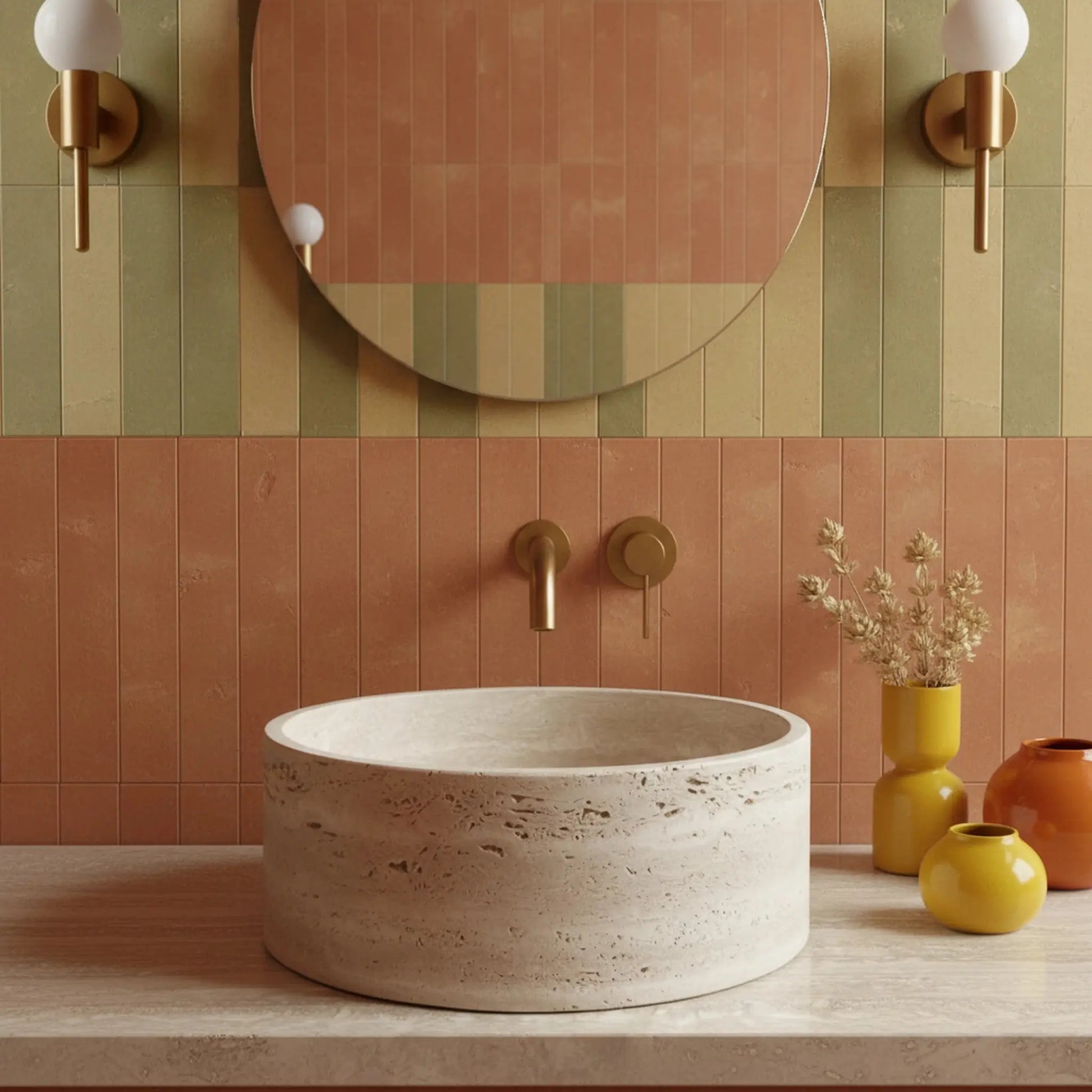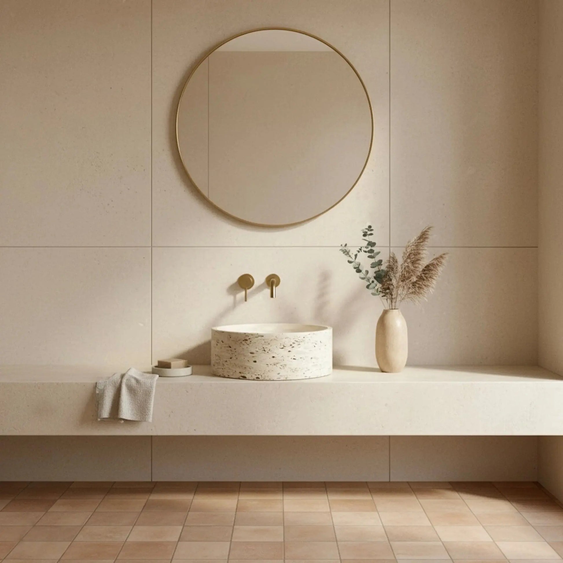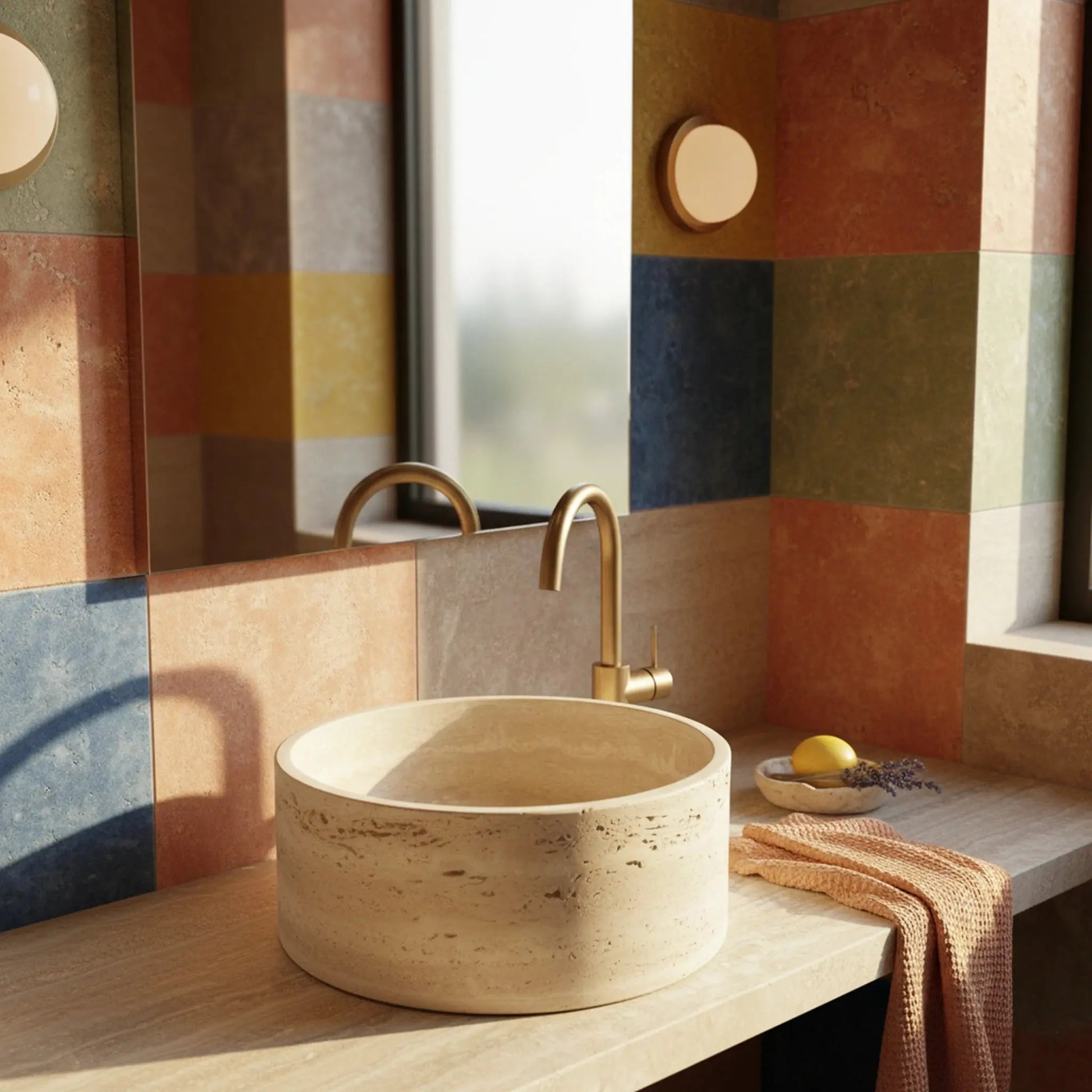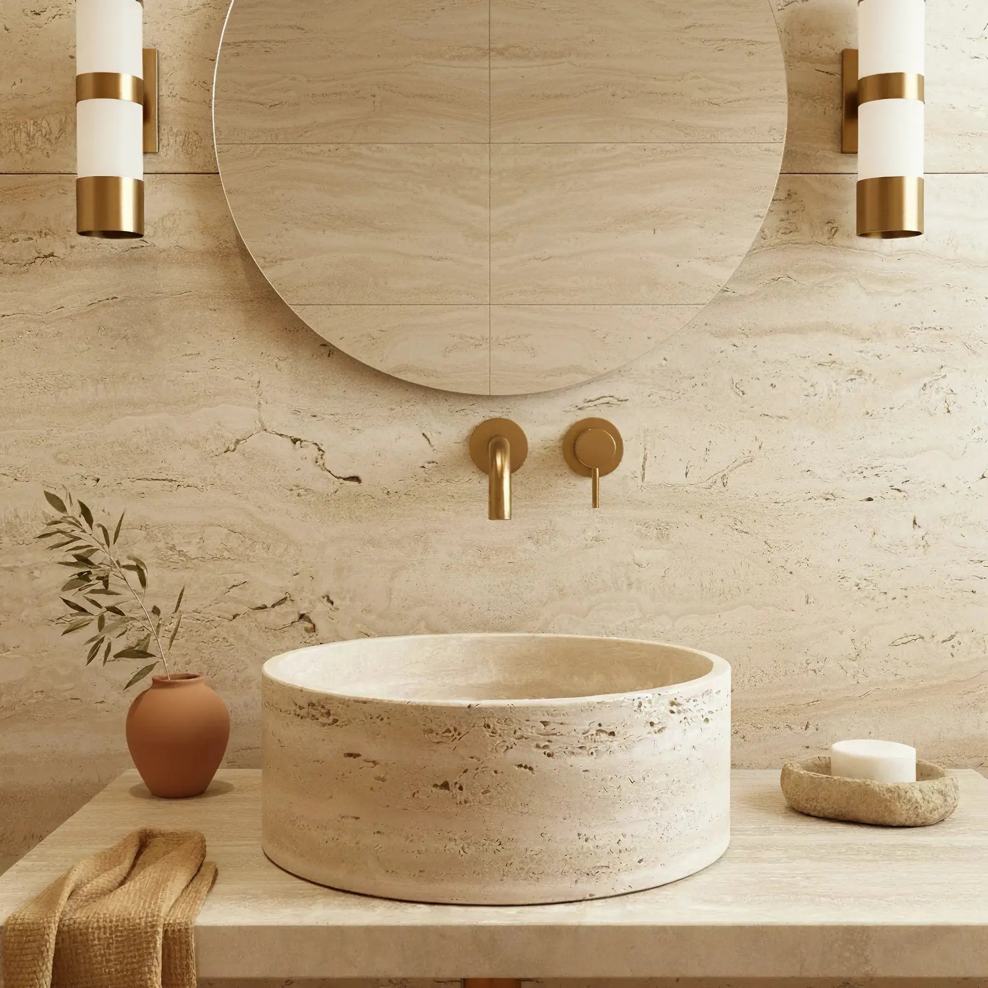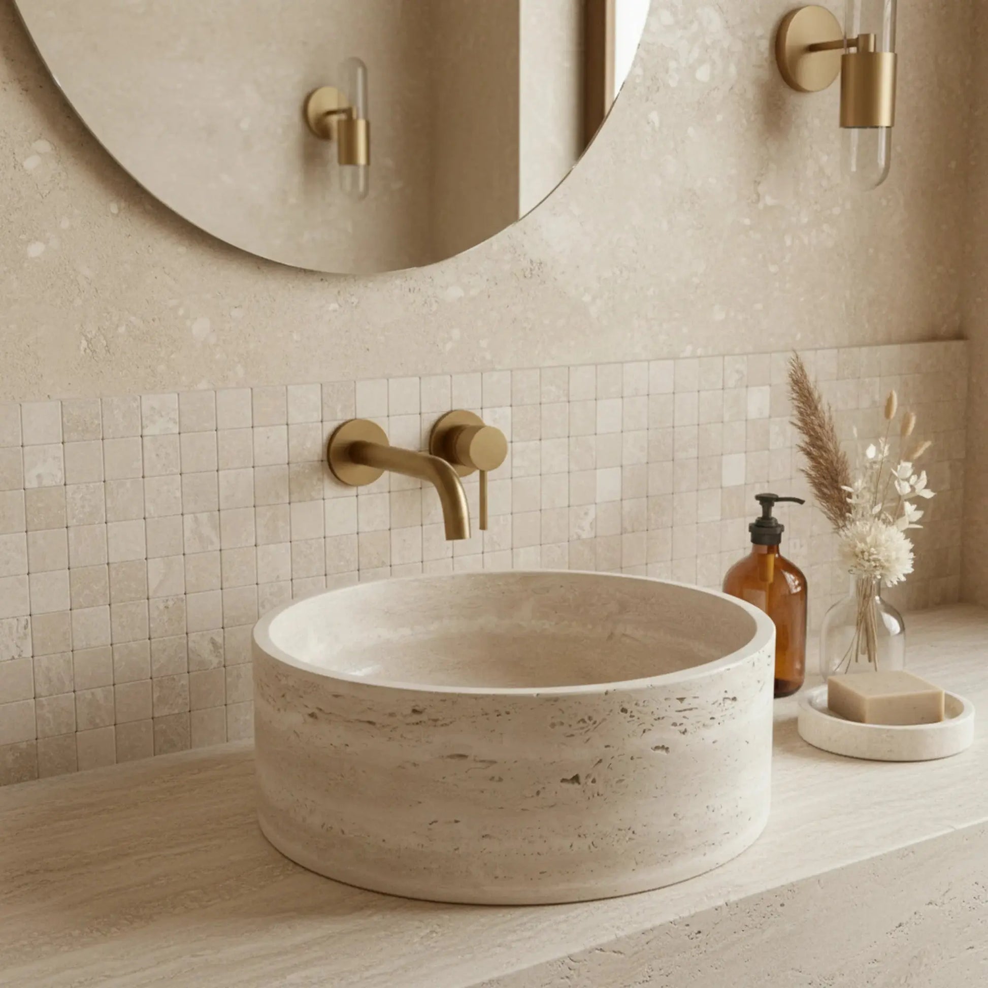 Cette vasque ronde est taillée dans un travertin romain haut de gamme, choisi pour ses nuances beiges, brunes, dorées et sable, typiques de cette pierre italienne historique. Chaque pièce est façonnée dans notre atelier de marbrerie en Moselle, où nos artisans contrôlent chaque étape pour garantir une qualité d’usinage supérieure.