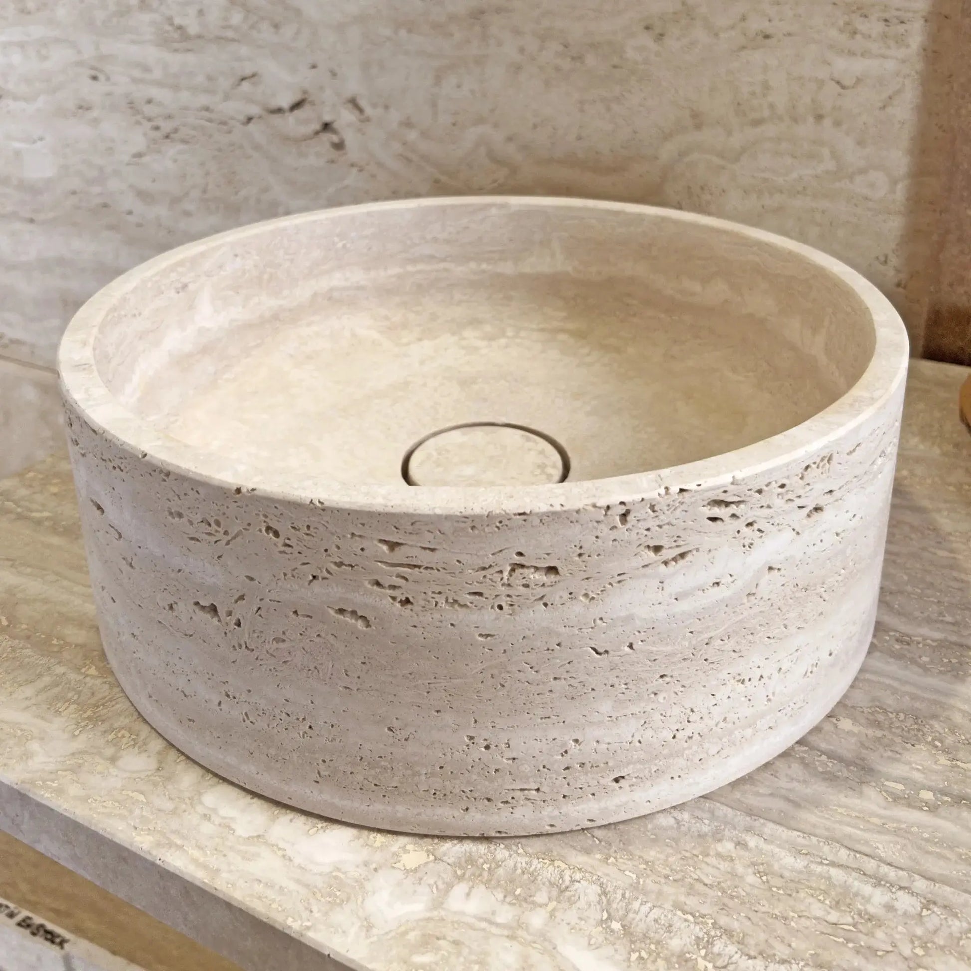 L’extérieur présente une finition brute sablée, non rebouchée, qui laisse apparaître les cavités naturelles du travertin et lui confère un charme authentique, minéral et sculptural — une esthétique impossible à obtenir sur les vasques industrielles entièrement mastiquées.
