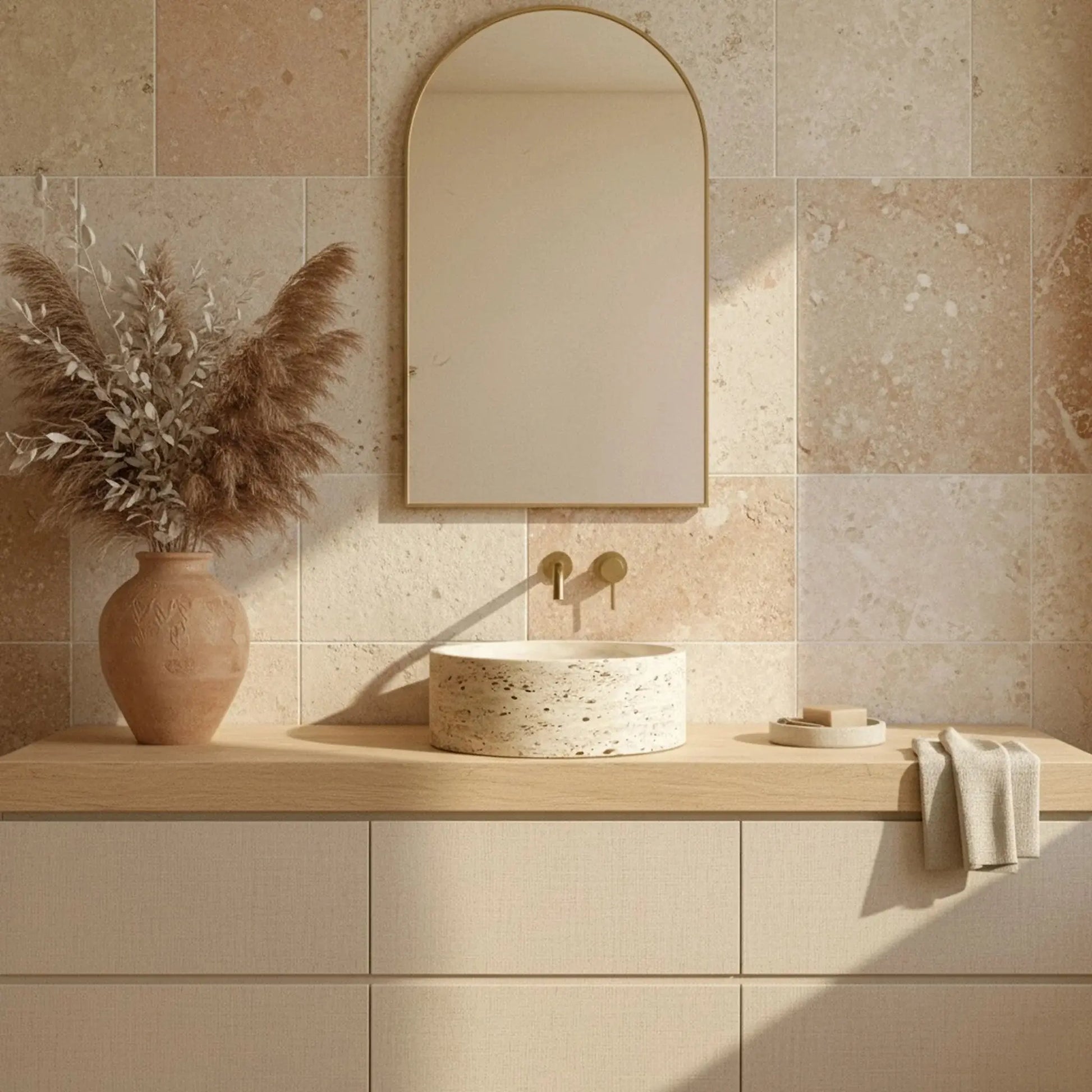 Grâce à sa texture naturelle et à ses couleurs intemporelles, le travertin permet d’aménager un espace complet, du plan vasque aux murs en passant par les sols.